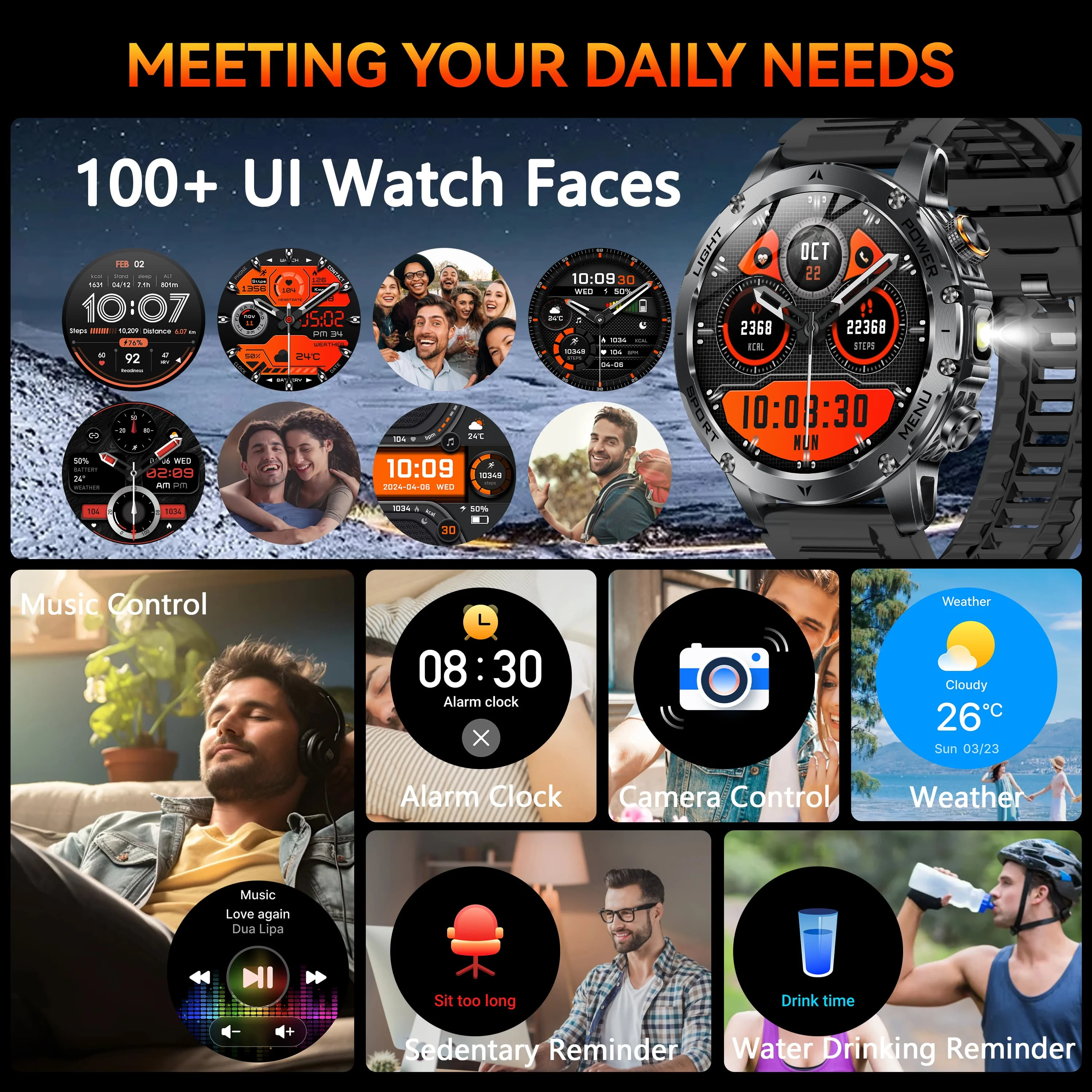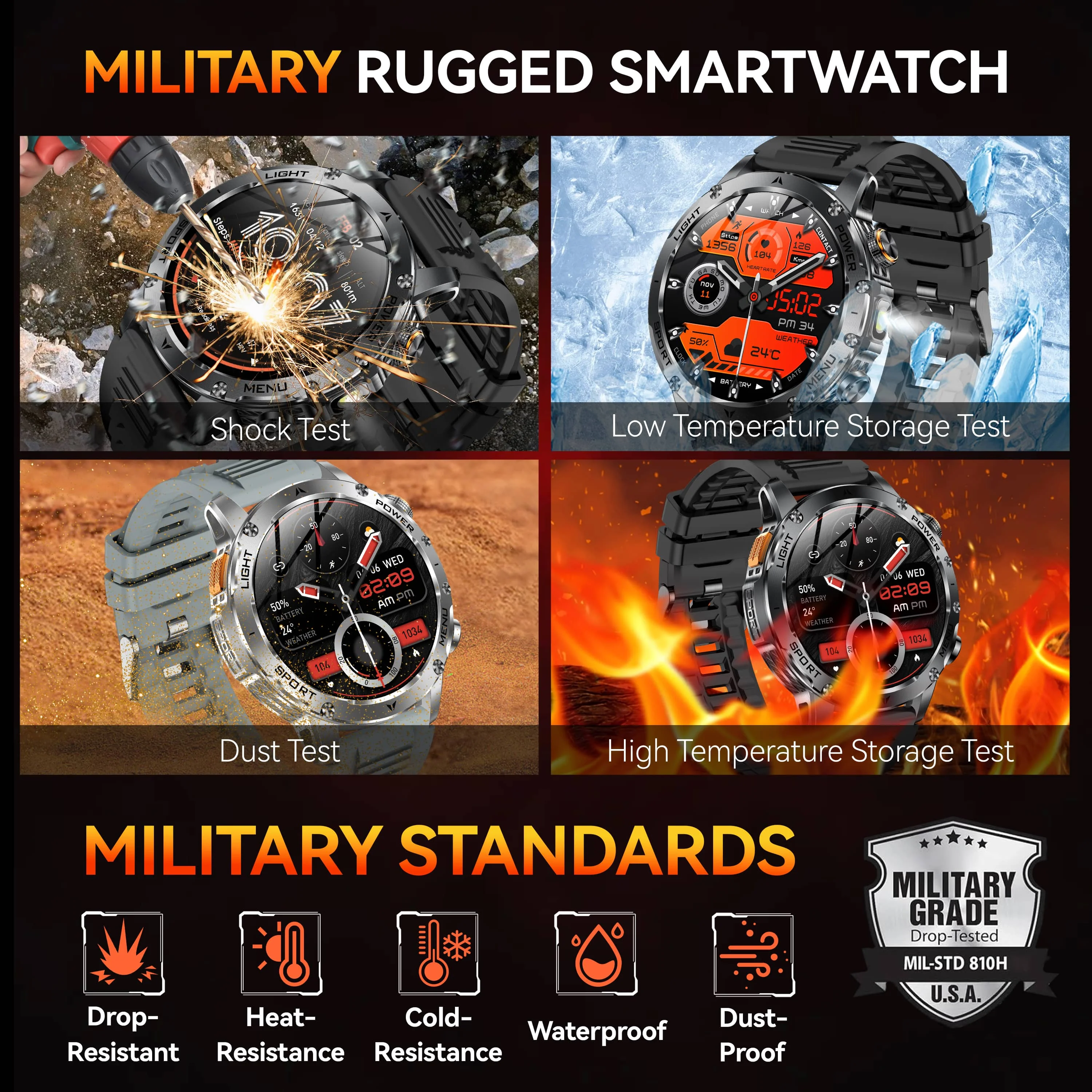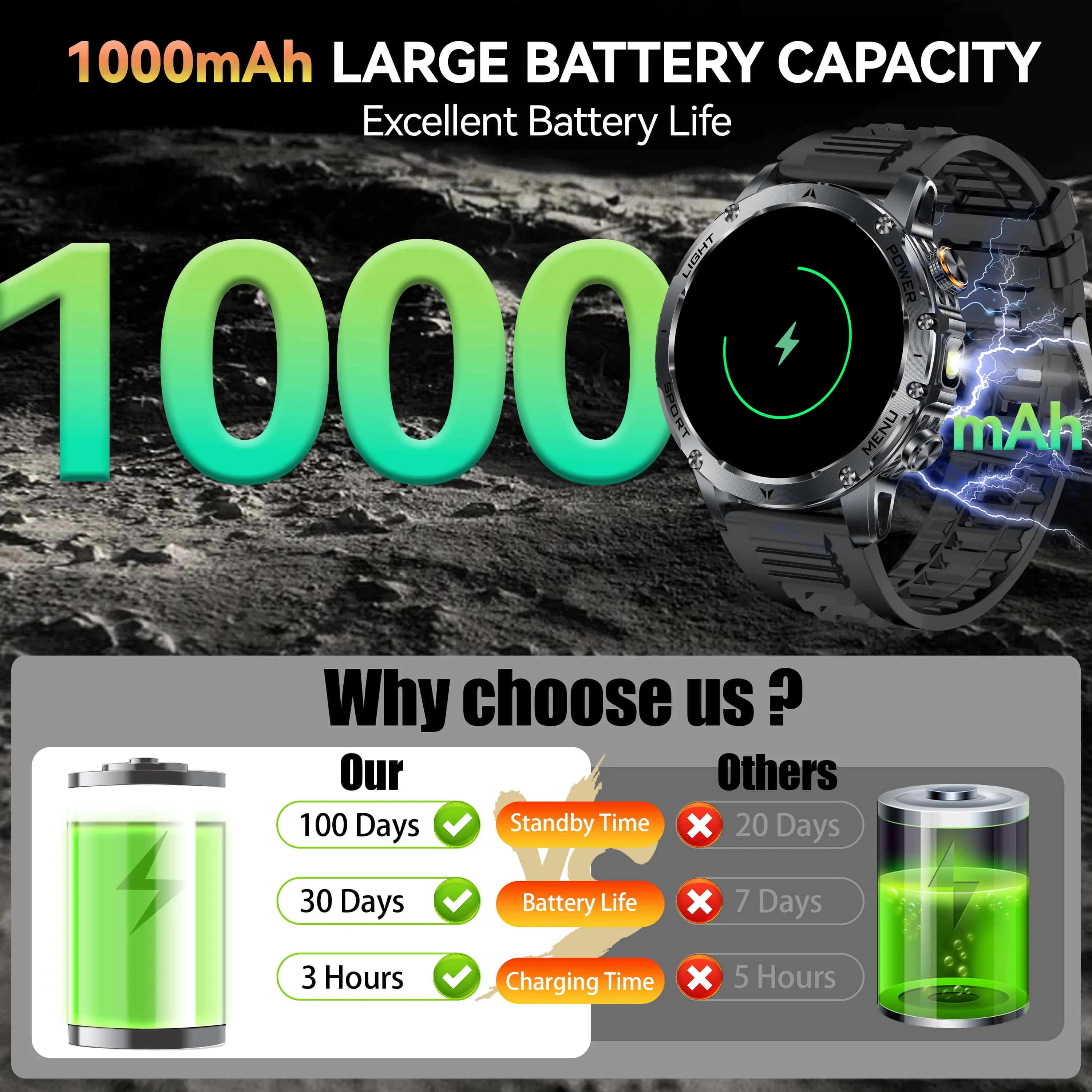 KPEP Military Smart Watch 1000mAh Large Battery LED Flashlight Health Monitor Wireless Call 100+ Sports Modes Smartwatch for Men